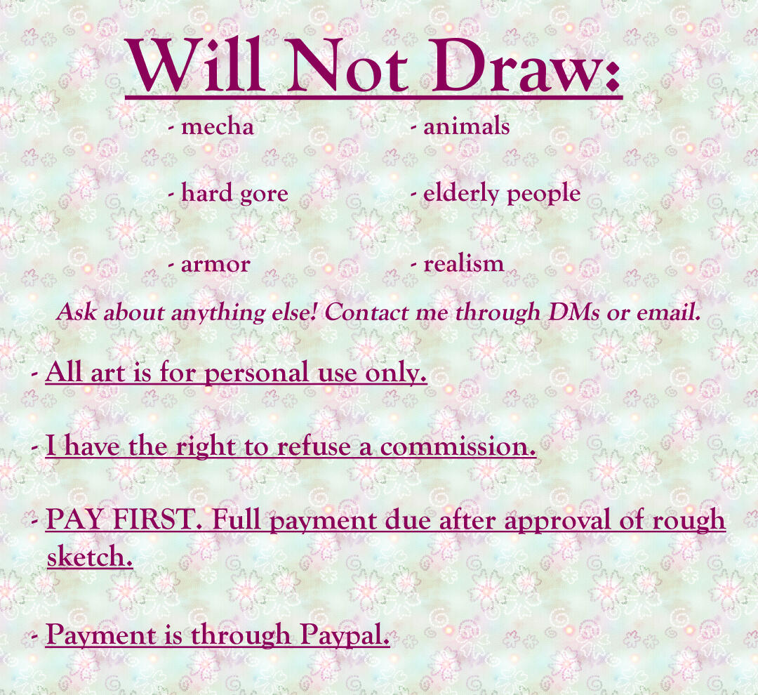 I am revamping my commission info here but feel free to message me on socmed to ask about specifics in the meantime!